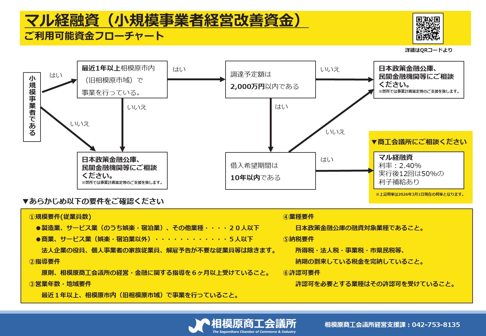 〈規模要件(従業員数)〉 製造業、サービス業のうち娯楽・宿泊業、その他業種・・・20人以下 商業、サービス業(娯楽・宿泊業以外)・・・5名以下 ※法人企業の役員、個人事業者の家族従業員、解雇予告が不要な従業員等は除きます。 〈指導要件〉 相模原商工会議所の経営・金融に関する指導を原則6ヶ月以上受けていること。 〈営業年数・地域要件〉 最近1年以上、相模原市(旧相模原市域)で事業を行っていること。 〈業種要件〉 日本政策金融公庫の融資対象業種であること。 〈納税要件〉 所得税・法人税・事業税・市県民税等、納期の到来している税金を原則完納していること。 〈許認可要件〉 許認可を必要とする業種はその許認可を受けていること |
