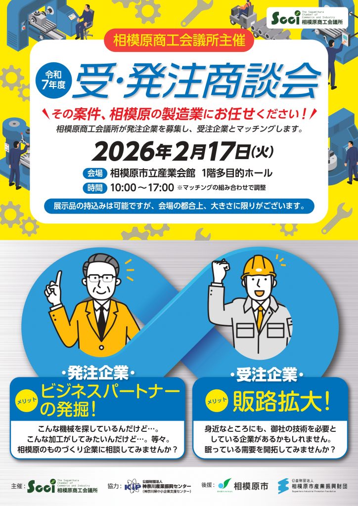 令和7年度受・発注商談会(発注企業)の申し込み 2025/11/10 カテゴリー:未分類 参加受付:受付中 <発注企業>の参加申込ページです。 ※受注企業の募集はコチラから(1/15~) 相模原商工会議所受発注商談会(発注企業)申込フォーム 事業所名(必須) 郵便番号(必須)※住所が自動入力されます 住所(必須)※番地以降は直接ご入力ください 電話(必須) FAX(必須) URL(必須) 資本金(必須)千円 担当者所属・役職(必須) 担当者氏名(必須) 担当者メールアドレス(必須) 【事業概要】 【求めている外注企業内容】製品・部品名 【求めている外注企業内容】加工内容 【求めている外注企業内容】必要設備 【求めている外注企業内容】材質 【求めている外注企業内容】特記事項 【お申し込みの確認について】 入力内容を「発注企業一覧」として相模原商工会議所HPに掲載することを承諾します注意事項及び以下「個人情報のお取り扱いについて」に確認・同意のうえ申し込みを行う 個人情報のお取り扱いについて 送信ボタンをクリック後、数分以内に自動配信メールが送付されます。弊所からのメールが届かない場合、大変お手数ではございますが以下問い合わせ先にお電話でご連絡ください。 お問い合わせ相模原商工会議所 産業振興課電話:042-753-8136 お問い合わせ対応時間は、平日8時30分~17時00分です。