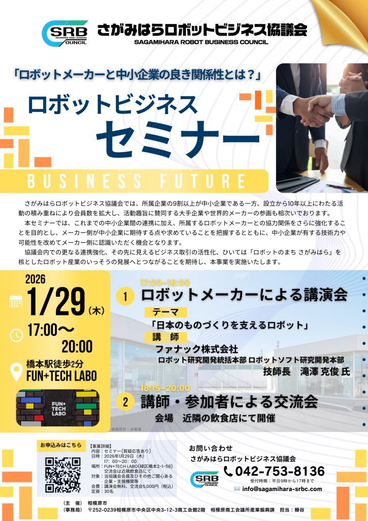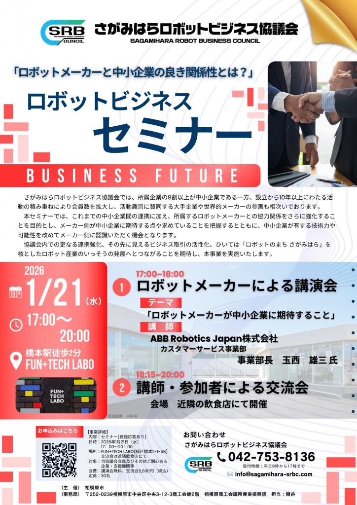 【さがみはらロボットビジネス協議会】1/21、1/29ロボットビジネスセミナー開催! 2025/12/12 カテゴリー:イベント 新着情報 外部団体 お知らせ 参加受付:受付中 ※ロボットビジネス協議会の会員以外の方もオブザーバー参加が可能です※ お申込みは、同協議会ホームページ(下記URL)よりお願いいたします。 1月21日ロボットビジネスセミナー (ABB Robotics Japan株式会社様ご講演) https://www.sagamihara-srbc.com/information/1-21seminar 1月29日ロボットビジネスセミナー (ファナック株式会社様ご講演) https://www.sagamihara-srbc.com/information/1-29seminar お問い合わせ相模原商工会議所 産業振興課電話:042-753-8136