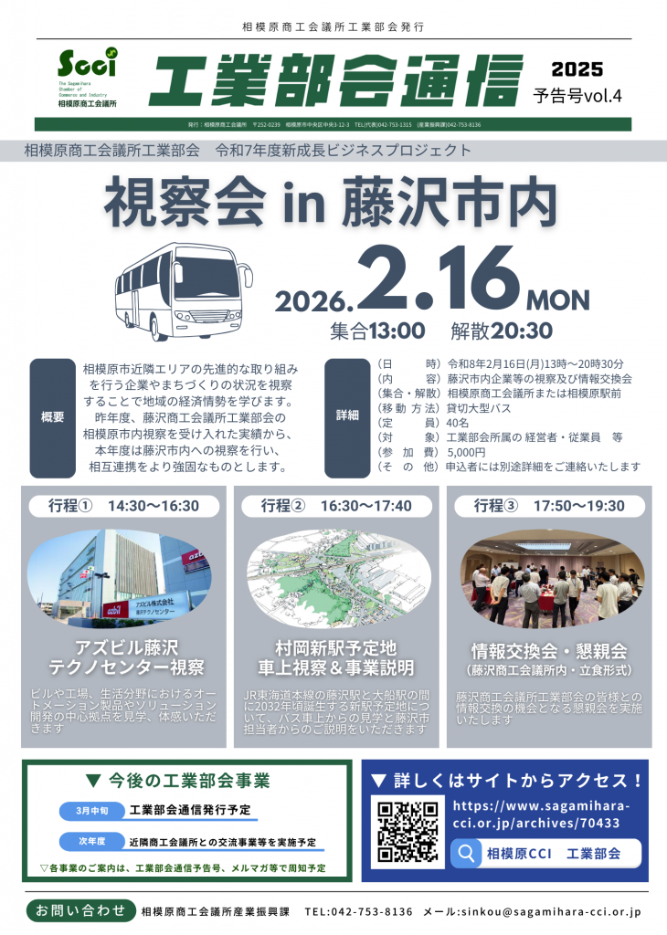| 行程等 | 〔貸切大型バスでの移動となります〕 13:00 相模原商工会議所集合(相模原駅前経由) 14:30 アズビル藤沢テクノセンター視察 16:30 村岡新駅予定地車上視察 17:00 村岡新駅予定地説明(藤沢商工会議所会議室内) 17:50 情報交換会・交流会開始 20:30 相模原商工会議所到着・解散 |