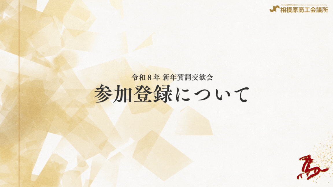 平素より当所の事業ならびに地域経済の発展に向けた取り組みに、多大なるご理解とご協力を賜り、心より御礼申し上げます。 令和8年新年賀詞交歓会は、6年ぶりに小田急ホテルセンチュリー相模大野を会場とし、より多くの皆様にご参加いただける設えをご用意しております。 厳しい社会情勢が続く中ではありますが、だからこそ、地域がつながり、支え合い、新しい挑戦を共有する機会が一層重要になっております。 私ども商工会議所は地域総合経済団体として、新たな挑戦に取り組み、変化に前向きに対応し、強いチャレンジ精神を持ち地域の中小企業がより大きく成長・飛躍されるように力強く支援を続けるべく、積極果敢に挑んで参る所存です。 本会では、地域企業・団体の皆さまが一堂に会し、新たな年の門出を祝い、交流を深めていただく場として新年がより実りある一年となるよう、微力ながらお手伝いできれば幸いです。 多くの会員事業所様にご参加いただき、新春の佳き日を、皆さまとともに祝えることを心より楽しみにしております。