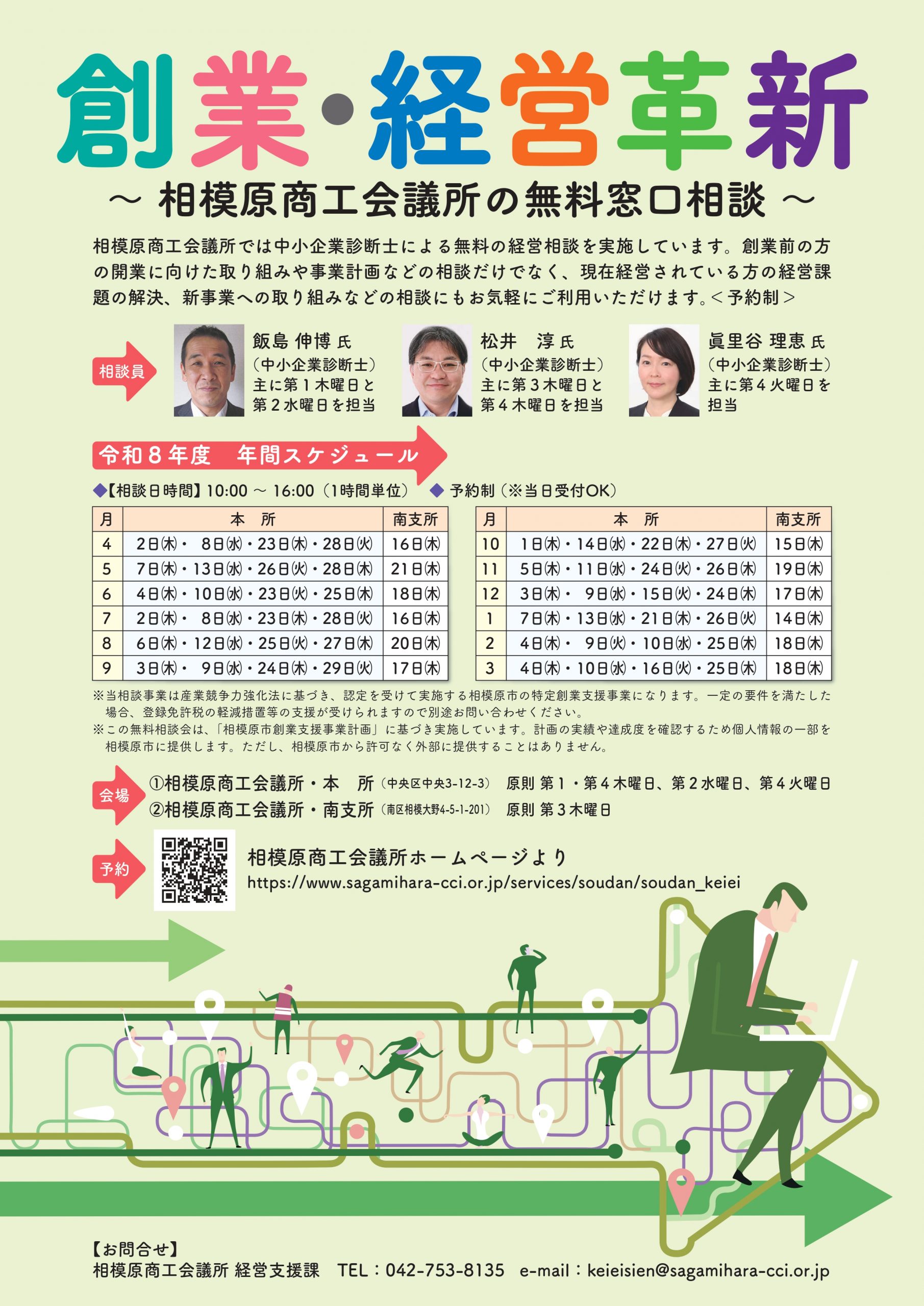 相模原商工会議所では創業前の方の開業に向けた取り組みや事業計画の策定、創業後間もない方の(概ね3年以内)経営課題の解決、新事業への取り組みをサポートするメニューを各種実施しています。※このページでご紹介する「相談」「講習会/セミナー」は、相模原市内で創業する際に優遇措置を受けることができる相模原市特定創業支援事業です。